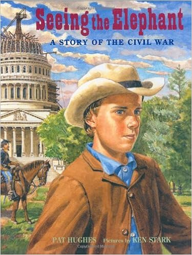 Hughes, Pat. Seeing the Elephant: A Story Of The Civil War. Pictures by Ken Stark. Farrar, Straus and Giroux. 2007.A thoughtful story about a ten year old boy named Iz whose two older brothers go off to fight on the Yankee side during the Civil War; one brother Cal is raring to fight, "I'm off to see the elephant" ("Seeing the Elephant" is a euphuism for "going into battle for the first time") but gets typhoid and has to come home before fighting a battle. Iz has no doubts that the Yankees have to fight to bring the Rebels back to the Union. His Aunt Bell is a nurse and she takes Iz back with her to Washington, DC. There he meets President Lincoln at a reception; however, he also meets a rebel soldier who is in a hospital and learns that fighting a war is not just a simple issue of right and wrong. Realistic paintings full of expression and historical setting enhance the quiet strength of this story