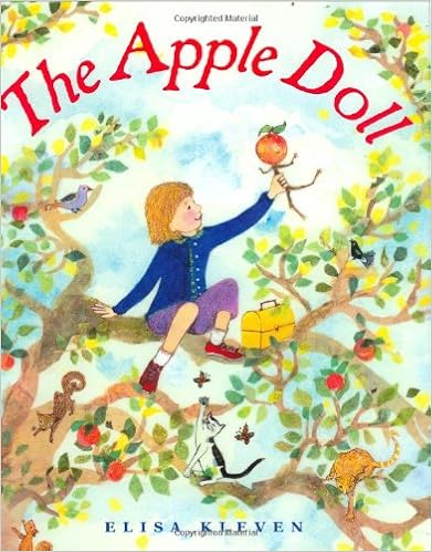 Kleven, Elisa, The Apple Doll, Farrar Straus Giroux, 2007Lizzie loves her apple tree where she often lies on a branch contently alone except for some birds and squirrels. She watches the tree change through the seasons, pretending that her tree is "a skeleton rattling in the autumn" a gingerbread cake with snowy frosting during winter, "a blossomy springtime cloud" and "a leafy summer circus"; charming vignettes show her eating snow in winter, and swinging upside down on a branch of the tree in summer. Soon however, it is her first day of school and Lizzie worries about whether she will make friends, Her sister tells her that she pretends too much and that school will be good for her because she can "make some real friends". Before starting off for school, Lizzie climbs up in her tree and picks her favorite apple, "round as a ball, warm as the sunlight-too happy to pack in her lunch box" and whispers to her apple that she has named Susanna that she is scared about going to school. She gives her apple a twig body and carries her apple doll to school but her teacher tells her to put her apple away until lunchtime and then her classmates tease her: one says, "Why don't you play with a real doll?" When Lizzie arrives home that first day, she gives Susanna yarn hair, dresses her in fabric and lace, gives her toys to play with and tells her that she does not have to go to school anymore. Lizzie who must return to school sits by herself in the playground and feels very lonely. A little girl stares at her as she eats her lunch all by herself. When the apple doll begins to deteriorate, Lizzie dries her; now Lizzie's doll has a wrinkled face atop a pipe cleaner body, and is dressed in fabric and lace.