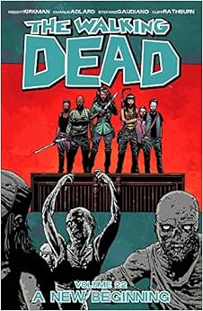 THE WALKING DEAD, Vol. 22: A New Beginning (issues 127-132 of the monthly series), and where could you possibly go after a story like the last one? It was war, there was near-total destruction, countless people died.So what does writer/creator Robert Kirkman do? He brings us a happy ending, of sorts.A New Beginning picks up two years later. The safe zones are well-established, and the roads between them well-guarded. Life inside the communities is becoming somewhat normal. There are jobs to do, livestock to raise, crops to tend. There’s even a bakery, churning out fresh bread.A new group arrives at the Alexandria settlement, led by the understandably cautious Magna. They seem eager to join the rest of the survivors, but something isn’t sitting right with her. Meanwhile, Carl is trying to convince his father to let him move to The Hilltop and become a blacksmith.But that’s not the thing that’s got everyone so worried. After barely making it back to the Hilltop alive, one of the scouts reports something both terrifying and ominous. The dead have begun to talk.A New Beginning was a difficult read for me. It wasn’t badly-written or anything, quite the opposite. But I’ve just spent so much time with these characters, going through their trials and tribulations with them, that it’s weird to see them all suddenly happy. Rick and Maggie share a moment to watch the sun set. Carl is trading wood carvings for clothes among his friends. Hell, Carl HAS friends. Even Eugene is happy, becoming a very important part of the community.One can only wonder what Kirkman’s got up his sleeve to tear this happiness into a million undead pieces.