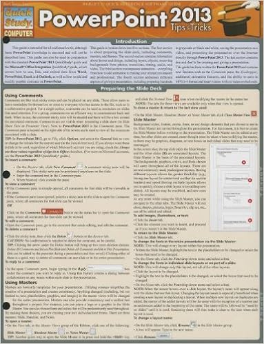 Powerpoint 2013 Tips & Tricks (Quick Study Computer) Expert Tricks and Tips that will make you a Minecraft expert: Tricks you are not aware of (minecraft, minecraft tips, minecraft tricks, minecraft monsters) How to Create Powerful Powerpoint 2010 Presentations Quickly and Easily: A Quick-start Guide to Using Powerpoint (Business Basics for Beginners Book 19) Microsoft PowerPoint 2013 Introduction Quick Reference Guide (Cheat Sheet of Instructions, Tips & Shortcuts - Laminated Card) GO! with Microsoft PowerPoint 2013 Brief, GO! with Microsoft Excel 2013 Brief, GO! with Microsoft Access 2013 Brief Top 25 Gymnastics Skills, Tips, and Tricks (Top 25 Sports Skills, Tips, and Tricks) Windows Vista: Top 100 Simplified Tips & Tricks (Top 100 Simplified Tips & Tricks) MOS 2013 Study Guide for Microsoft PowerPoint (MOS Study Guide) PowerPoint 2016 For Dummies (Powerpoint for Dummies) PowerPoint Presentation Secrets - Create Beautiful Slideshows and Impress Audiences with Microsoft PowerPoint While Saving Time and Money (Unofficial) Exploring: Microsoft PowerPoint 2013, Comprehensive (Exploring for Office 2013) Enhanced Microsoft PowerPoint 2013: Comprehensive (Microsoft Office 2013 Enhanced Editions) Grammar Girl's Quick and Dirty Tips for Better Writing (Quick & Dirty Tips) MAGIC TRICKS: How to do easy illusions and magic card tricks for kids (magic, tricks) Magic Tricks - 50 Simple, Fun and Quick Tricks Book (How To Be the Life of the Party) MOS 2010 Study Guide for Microsoft Word, Excel, PowerPoint, and Outlook Exams (MOS Study Guide) The NEW Quick & Easy Block Tool!: 110 Quilt Blocks in 5 Sizes with Project Ideas - Packed with Hints, Tips & Tricks - Simple Cutting Charts & Helpful Reference Tables Excel Tips & Tricks (Quickstudy: Computer) Microsoft PowerPoint 2013: Comprehensive (Shelly Cashman Series) The O'Leary Series: Microsoft Office PowerPoint 2013, Introductory