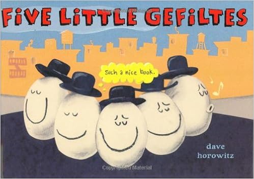 Five little smiling Gefilte fish balls wearing top hats (one is always whistling) greet us on the cover of this amusing parody of the "Five Little Ducks" song. They go out daily from their jar to experience city life, bouncing down the wrought iron fire escape, "taking in a play", swimming in the bay "crashing the deli buffet", an getting "shlepped away" in a yellow taxi. Unfortunately for Mama Gefilte, one less gefilte returns each day, causing her to cry out "OY VEY" in consternation, until they all return happily to where the babushka-wearing Mama fish ball sits on her park bench. She stops kvetching, and now kvells with happiness. The funny asides on signage and within the illustrations are clever inside Yiddish jokes for the older crowd, but the book stands on its own as a delightful frolic through New York's Jewish scene. This book needs to be sung--the zanier the better! Share with some kids ASAP--just avoid serving Gefilte fish to those who won't appreciate it!