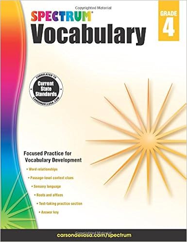 I was a little worried about my son's vocabulary before we found this good workbook. It contains word relationships, passage-level context clues, sensory language, roots and affixes, test-taking practice section, and answer key. It has comprehensive, fourth grade-specific vocabulary practice to prepare for the year. If you find your child's vocabulary is not large enough, do get this book and have him/her learn the skills from this book. It not only reinforces classroom learning, but also enriches and enhances educational concepts. It further supports the test-taking skills, which greatly helped my son to succeed in his tests. He's already seeing how the techniques help him in his normal vocabulary work. He is now probably the student in his class who has the largest vocabulary. In the Beestar online tests (a nice web site beestar.org), he is ranked high in the honor roll. I’m very pleased with this book. It makes vocabulary learning fun to my son.