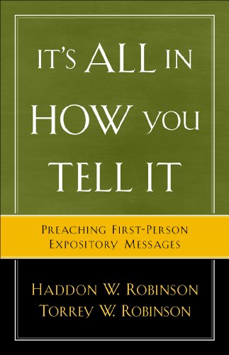 After reading Haddon and Torrey Robinson's "It's All in How You Tell It," I think that there is little to no chance that I will ever use this method of preaching. In short, first-person expository messages involve the preacher assuming a historical/biblical character and telling that person's story from their perspective (possibly involving things like costumes, props, makeup, etc.) Quite simply, I think it would be a complete disaster for me to try to play a "character" in any situation in which the goals included something beyond comedy. I don't have the acting chops for it.Let me clarify that I think that this approach is perfectly legitimate in the right hands. But what they are talking about is a creative and artistic endeavor that not everyone can execute. This is analogous to suggesting that all preachers should not only write but also perform their own spiritual songs because we know that people learn well when information is transmitted through music. Yikes, what a frightening thought!! But somehow, we assume that drama is the artistic form that everyone can do well. I've seen enough absurdly bad church drama to be quite apprehensive to open the flood-gates of first-person expository messages.Though the appendices at the end (7 sample first-person expository messages) are supposed to offer compelling examples of this technique, they instead left me even more wary of trying it. Most of those messages seemed exactly like the poorly written stuff that we need to avoid. Just as much with the delivery, the writing of these sorts of messages has the potential to be very powerful, but only for folks who are gifted in that way.